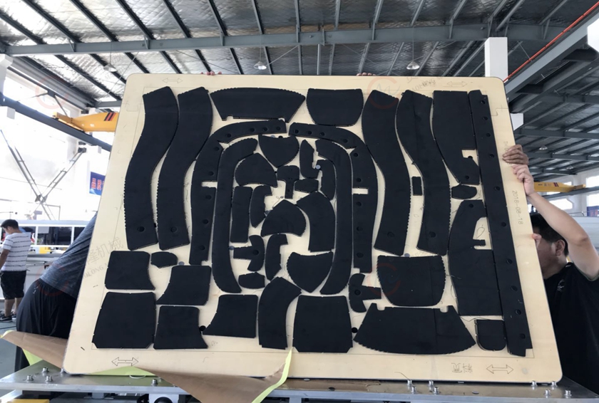 适合发泡材、纸板、纺织物、塑胶材料、皮革、橡胶、包装材料、地板材料、地毯、玻璃纤维、软木等材料之刀模裁断,适合各种产业的裁断作业。本客户是做汽车后排座椅的,一模一整套座椅成品