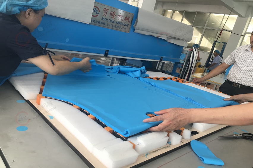 此设备适用于片状材料,对一系列的CPE、PE膜、PP+PE等防护产品、塑料、皮革、泡棉等非金属材料进行模压成型作业。
